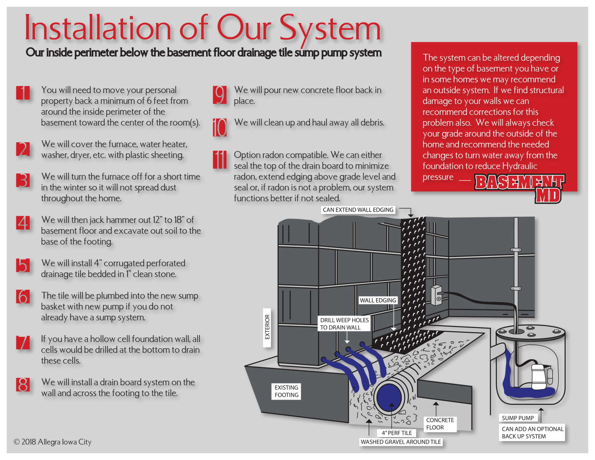 The system can be altered depending on the type of basement you have or in some homes, we may recommend an outside system. If we find structural damage to your walls, we can recommend corrections for this problem as well. We will always check your grade around the outside of the home and recommend the needed changes to turn water away from the foundation to reduce hydrostatic pressure.